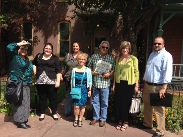 Colorado Pro Chapter Society of Professional Journalists and Colorado Press Association representatives visited the Metropolitan State University of Denver journalism program on Sept. 14. Left to right: Linda Shapley, director of news operations at The Denver Post; Nikki Work, Greeley Tribune reporter and MSUD graduate; Gabrielle Porter, Evergreen Newspapers reporter and MSUD graduate; Marilyn Starrett, MSUD public relations assistant professor of journalism; Kenn Bisio, MSUD professor of photojournalism; Joanna Bean, editor of The Colorado Springs Gazette; Jerry Raehal, CPA CEO. SPJ Colorado Pro president Ed Otte was also on the visitation team.