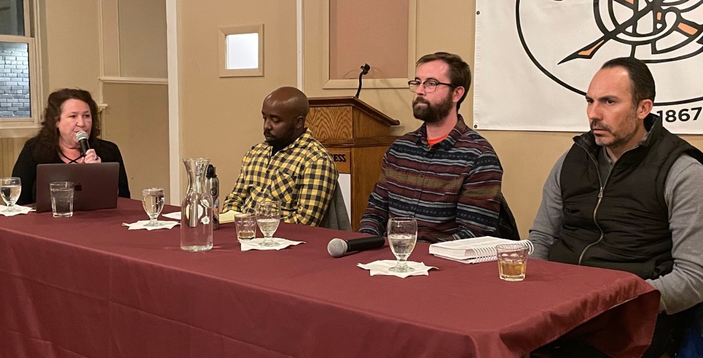 The panel, held at the Denver Press Club on Nov. 17, included, from left, Marcus Hill, a staff reporter at the Colorado Springs Independent; Robert Davis, a Contributor to Denver VOICE; and Jeremy Jojola , 9News investigative reporter.